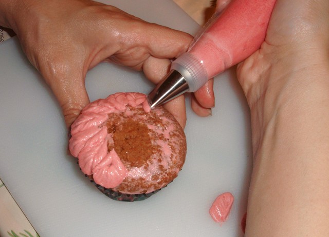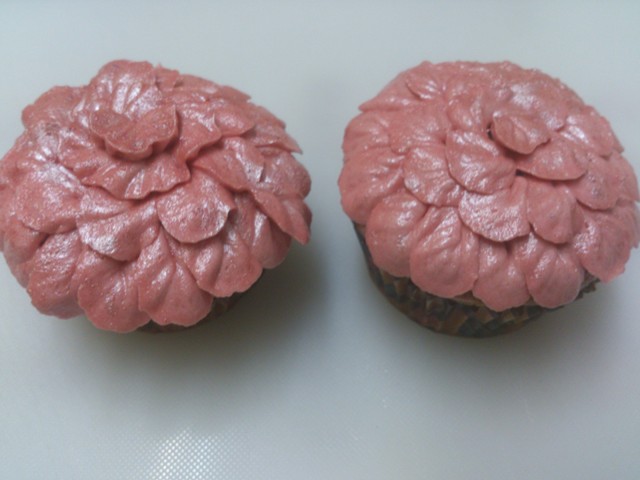 Preparamos la manga pastelera con una boquilla con forma de pétalos. Tal y como indica Pastelería creativa (nº 51 del coleccionable de Planeta de Agostini) empezamos a decorar por la parte más inferior creando una fila de pétalos. Colocar la boquilla en el borde del cupcake, de manera que la parte más fina quede hacia fuera. Formar pétalos moviendo la boquilla hacia arriba, dando una vuelta y volviendo al punto en que se empezó. No creáis, a mí me salió bien a la tercera, jejeje, pero tenía muchos cupcakes para practicar. Y si no, quitáis la buttercream con una espátula y a volver a empezar, como hice yo. Así vais haciendo pétalos hasta completar 3 filas. En el centro hacer un volante inclinando hacia arriba la boquilla. Al terminar espolvorear por encima con un poco de purpurina comestible. Y así hasta completar los que queramos decorar.