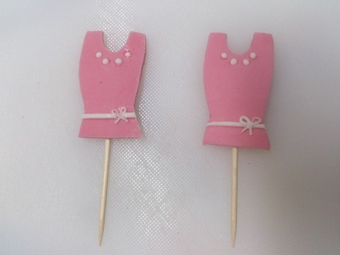 Con una plantilla de papel de horno, a ojo de buen cubero o con un molde si lo tenéis, cortáis el fondant rosa en forma de mallot y lo adornáis con pequeñas perlas de fondant blanco y otra tira a modo de cinturón. Por detrás le colocáis un palillo y un trocito de fondant que lo sujete pegado con un poco de agua. Dejáis secar y reserváis.