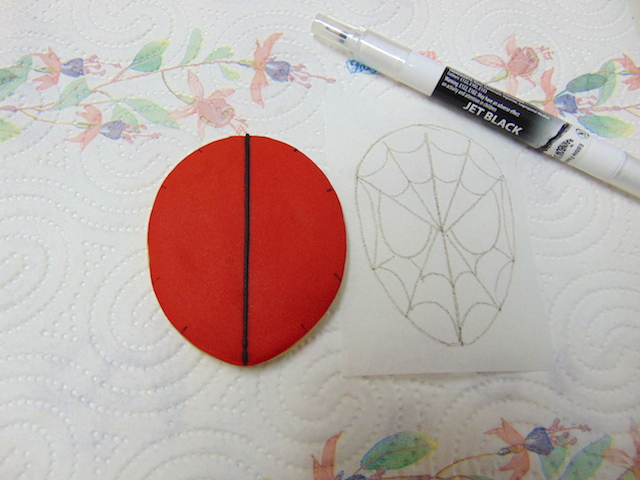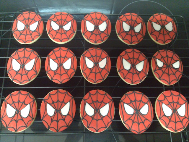 En el caso de Spider-Man hice lo mismo, me marqué cn el rotulador los puntos para que me fuera más fácil hacer las rayas de la tela de araña. La plantilla la hice yo misma con papel sulfurizado calcando la máscara de una imagen, con el rotulador comestible. No tenía molde del hombre araña así que achaté un poco uno redondo para darle forma más ovalada.