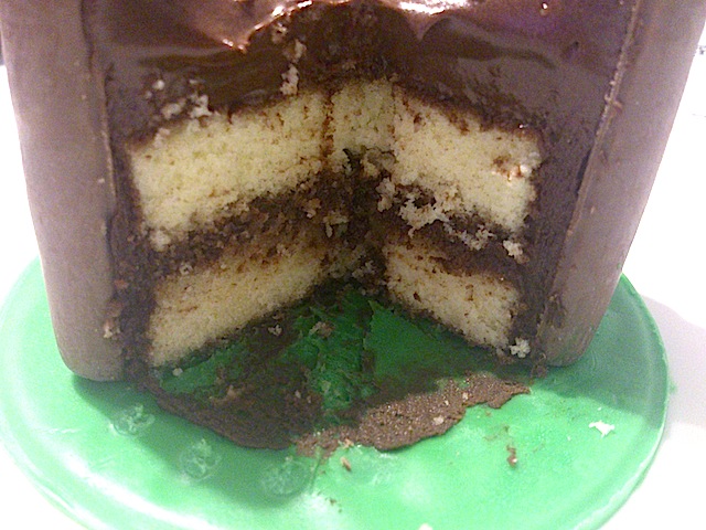 Como podéis ver en el pastelito usé un bizcocho de vainilla con ganaché de chocolate.