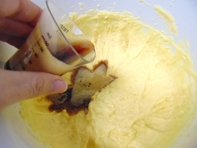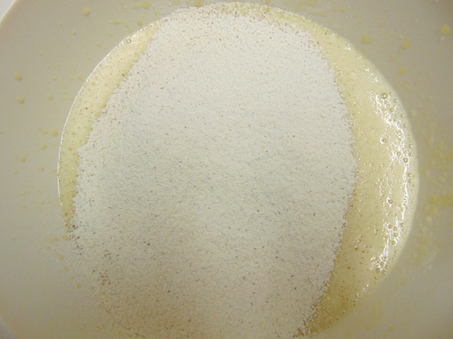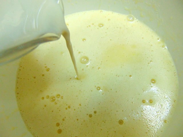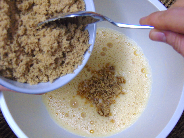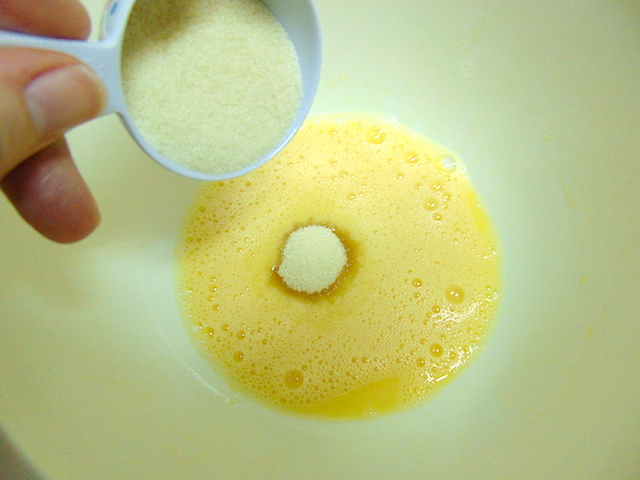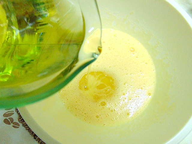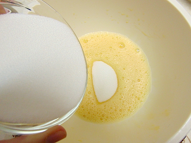 Añadir el azúcar y seguir batiendo. Cuando esté bien integrado añadir el aceite poco a poco y seguir batiendo.