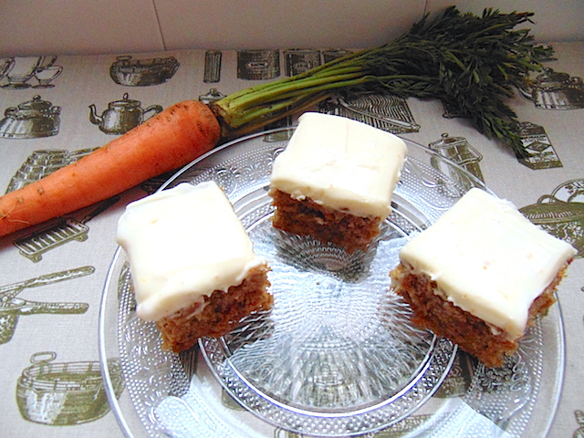 La zanahoria es una hortaliza cuyas raíces son comestibles. Se cultiva desde hace siglos (600 a.C.) y procede de la zona de Irán y Afganistán. En su origen era púrpura (por la presencia de antocianinas) o amarilla y con raíces bifurcadas. Posteriormente los holandés crearon una variedad naranja más rica en carotenos para reivindicar el color oficial de la casa Orange-Nassau holandesa. También existen otros colores, como el blanco, amarillo, rojo y púrpura. Esta tarta tan jugosa desciende de los antiguos budines que se preparaban en Europa en la Edad Media. La falta de azúcares hacía que se prepararan postres a base de zanahoria y calabaza que por su sabor dulce les hacía las veces de azúcar natural. Las primeras referencias escritas de estos budines datan del s. XVI. Es en s. XIX cuando realmente se empieza a hacer referencia escrita a la Carrot cake. La primera publicación de la versión moderna de la Carrot Cake aparece en una publicación de 1.929, The Twentieth Century Bride’s Cookbook, en un libro publicado por un club de mujeres de Wichita, Kansas en USA. En 1.960 se introduce el glaseado de crema de queso en USA y realmente es cuando empieza su popularidad que se extiende por todo el mundo. A los americanos les encantan las leyendas y el patriotismo, y aún con su corta historia como país tienen muchas, se dice, se comenta, que el 25 de noviembre de 1.783 George Washington se tomó un trozo de Carrot cake en la mítica Fraunces Tavern en el Bajo Manhattan, el día de la evacuación británica, en la Guerra de la Independencia americana. En fin, eso dicen.