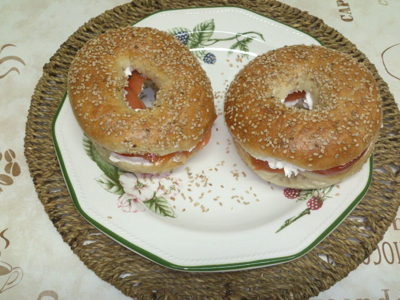 Y unos deliciosos bagels de salmón ahumado y Philadelphia que saqué más tarde: una buena capa de Philadelphia, cebolla tierna y cebollino bien picados, y salmón noruego ahumado en abundancia. Así le damos el punto salado a la merendola.