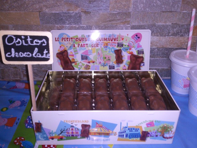 Banderín de cartulina y letras de fieltro.    Ositos de nube y chocolate de Disneyland París.