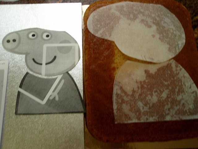 ¿Cómo hacer la silueta de Peppa Pig para la tarta? Imprimí una imagen de Peppa Pig, la fotocopié en A3, la calqué en papel de horno y la recorté.