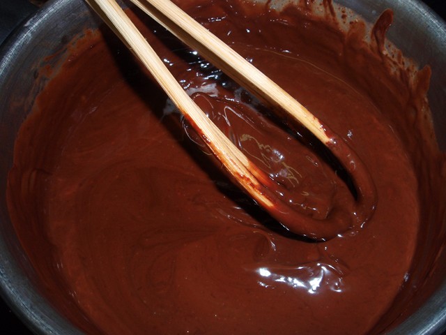 Como en otros montajes rebanáis la pieza, untáis de rico almíbar al gusto, rellenáis con la buttercream, montáis el «sandwich» manteniendo el lugar original de cada pieza y cubrís con el ganaché de chocolate. Yo normalmente utilizo espátulas calentadas con agua y bien secas, una larga de metal para la parte superior y para los laterales una de plástico más cuadrada. Pongo la primera capa «cubremigas» y a la nevera un rato, lo suficiente para que solidifique (una hora más o menos). La siguiente capa nos servirá para igualar pequeños desniveles, se puede cubrir directamente con el fondant.