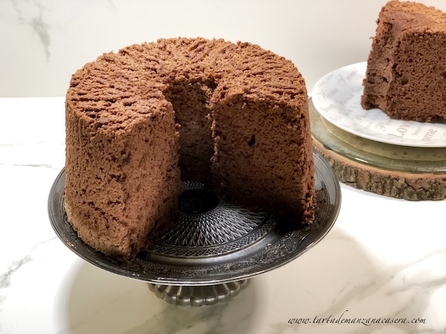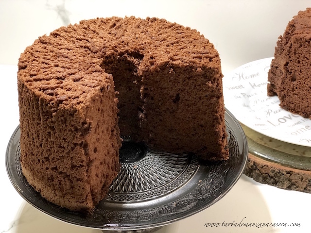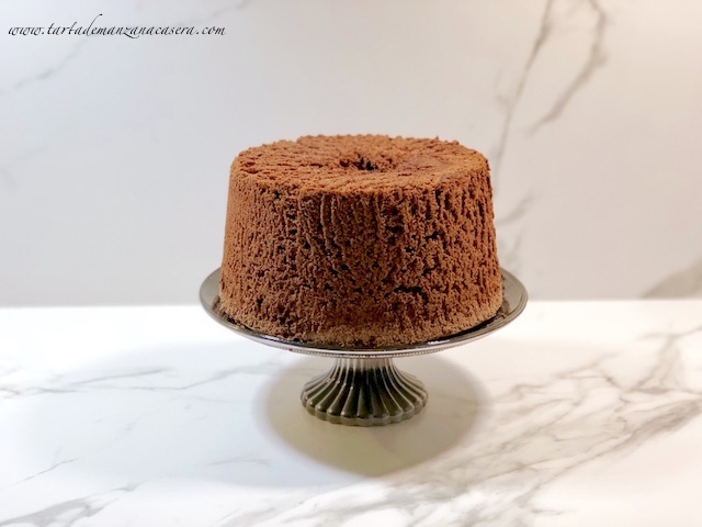 El Angel Food Cake es un bizcocho esponjoso y muy muy aireado. Lo podríamos traducir como Bizcocho de Ángel. El secreto es formar un buen merengue francés. Un bizcocho de claras, sin levadura, sin materia grasa y el resultado es como nube de azúcar. Riquísimo. Eso sí si le tengo que poner una pega es el desmoldado. Se ha de utilizar un molde hondo especial con chimenea, patitas y de aluminio y bajo ningún concepto se untan las paredes del molde con mantequilla o aceite, va «desnudo». La masa sube agarrándose a las paredes del molde, de ahí que no se engrase. Una vez horneado se le da la vuelta al molde y se deja así durante 1h, de lo contrario el bizcocho baja. Pasado ese tiempo, para desmoldarlo, se separa el bizcocho de las paredes con la ayuda de una espátula haciendo un movimiento circular para despegarlo. Después se utiliza la misma técnica para retirar la chimenea. El desmoldado no es el más perfecto pero el resultado del bizcocho es increíble.