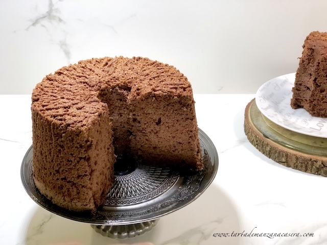 Primero precalentar el horno a 170ºC y dejar el molde (el mío es de17,7 cm, de Wilton) de Angel Food Cake a mano. Tamizar la harina y el cacao un par de veces y reservar. Batir las claras a punto de nieve con la sal y el cremor tártaro tamizado. Empezamos a poca velocidad y vamos aumentando hasta que se formen picos blandos. Sin dejar de batir, a velocidad más lenta, añadimos poco a poco el azúcar, a cucharadas. Una vez incorporado todo subir la velocidad y batir hasta que quede un merengue firme y brillante. Ha de formar el pico que veis en el paso a paso. Añadimos el extracto de vainilla e integramos. Después vamos añadiendo la mezcla de harina y cacao tamizados a velocidad más baja. Una vez incorporadas todas las cucharadas acabamos de integrar con la ayuda de una espátula con movimientos envolventes, intentando perder lo mínimo del aire que hemos ganado en el batido del merengue. Cuando la mezcla esté uniforme la verteremos en nuestro molde SIN ENGRASAR y alisaremos con la espátula. Hornear a media altura durante unos 40-45 minutos SIN ABRIR el horno en ningún momento. Una vez pasados los 40 minutos comprobaremos que la superficie no esté húmeda y haremos la prueba del palito. Si al pinchar en el centro sale limpio está listo, si no hornear unos minutos más. Inmediatamente después de sacarlo del horno le daremos la vuelta al molde que quedará apoyado sobre las patitas de aluminio. Dejaremos en esta posición durante 1h de lo contrario el bizcocho baja. Pasado ese tiempo, para desmoldarlo, se separa el bizcocho de las paredes con la ayuda de una espátula haciendo un movimiento circular para despegarlo. Después se utiliza la misma técnica para retirar la chimenea. El desmoldado no es el más perfecto pero el resultado del bizcocho es increíble. Y esa miga está diciendo cómeme.