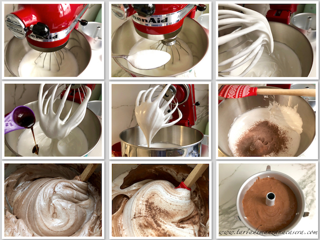 Hace muchos años no tenía ni batidor de varillas, mi batidor era un tenedor y cuando veía una receta en algún coleccionable de revistas de mi madre y leía «batir a punto de nieve» me echaba a temblar. Automáticamente cambiaba de receta. Desde hace unos pocos años tengo todo un arsenal de gadgets de cocina y mi maravillosa Kitchen Aid que tanto facilita el trabajo de este tipo de recetas. Llevaba mucho tiempo queriendo hacer este bizcocho pero me resistía a comprar otro molde más. Después de la reforma me cabe todo en su sitio y sin aperturas pero si sigo comprando menaje reposteril como si no hubiera mañana al final lo que necesitaré es un piso nuevo. Pero al final no me he podido resistir, y ha sido una muy buena inversión. Ya he hecho 3 en un pis pas. En casa ha triunfado como la Coca-Cola. La versión natural es la favorita y a esta también le han dado el visto bueno.