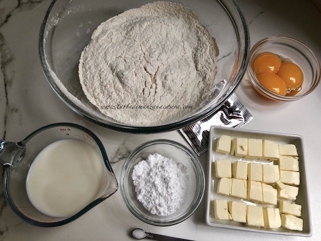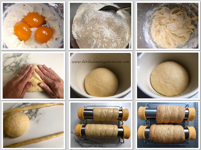 Vamos con la receta, ingredientes a temperatura ambiente. Podéis utilizar levadura fresca o seca de panadero tanto la normal como la instantánea (ver Dulcepedia). La receta que he utilizado es la que más veces he visto en la red y curiosamente la que viene en las instrucciones del molde de Tescoma. Son todos de andar por casa. La receta es sencilla. Importante respetar el tiempo de levado. Conseguir una masa lisa y elástica. Enrollar con cuidado sobre los tubos previamente untados con un poco de aceite o mantequilla. El último trozo a enrollar lo colaremos bajo el anterior para que no se nos suelte durante el horneado. La primera hornada es de entrenamiento, se me descolgó y rompió uno de ellos, visto el error la siguiente quedó mejor. No os excedáis poniendo masa, ni la pongáis demasiado fina.