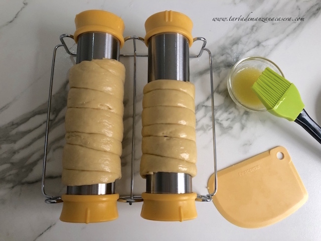 Me traje un molde especial de Trdleník de la marca Tescoma de Praga, allí sus productos son los más vendidos. Podéis encontrarlo en su página online española. No es imprescindible tener el molde porque podríais utilizar unos botes de refresco o botellines de cerveza forrados de papel albal pero bueno, yo por comodidad, me traje mis moldes bajo el brazo. Los originales se hacen sobre brasas o fuego pero estos se hacen al horno. Aunque ya os digo yo que están también deliciosos. Si no tenéis este molde podéis forrar unas latas de refresco con papel albal y listo. Los horneáis en vertical.