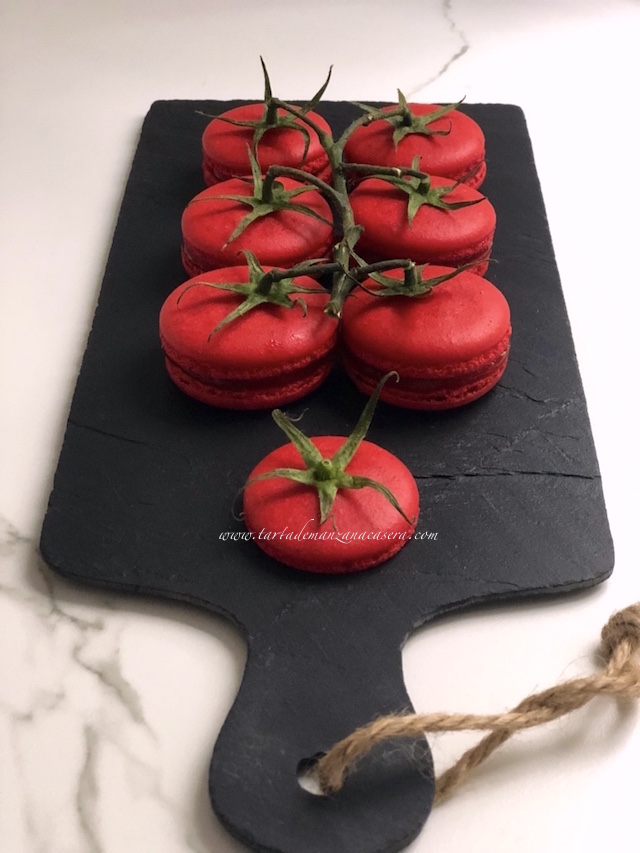 Hacía tiempo que no preparaba macarons y como estamos en temporada de tomates quería hacer dos cosas. Primero que esta vez fueran salados, sí, no estoy loca, los hay salados y no son los primeros que preparo. La masa es la misma pero en este caso con un toque especial. Y segundo, desde que hacía los cursos de macarons con mi sensei Belén de Cupcakes a Gogó tratamos el tema de los trampantojos y macarons con formas. Pues estos los vi y me enamoré, y era cuestión de tiempo que los hiciera. Los vi en Pinterest, ese maravilloso escaparate qué tanto me gusta. El caso es que estos los vi en una página de una pastelería de Australia y yo he hecho mi propia versión.