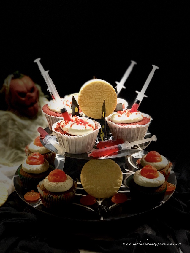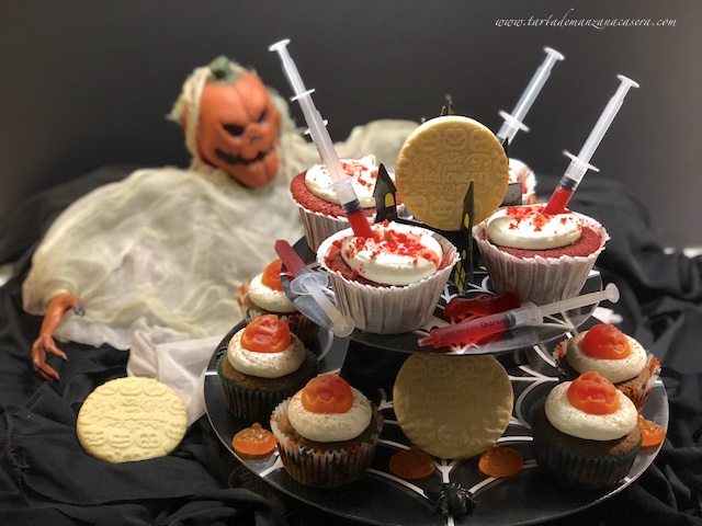 Como estos Cupcakes Red Velvet con queso crema y un atrezzo rojo sangre.
