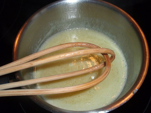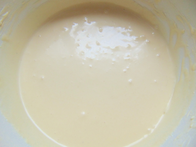 Añadir los huevos de uno en uno mezclando bien después de cada uno de ellos. Finalmente agregar la nata líquida.