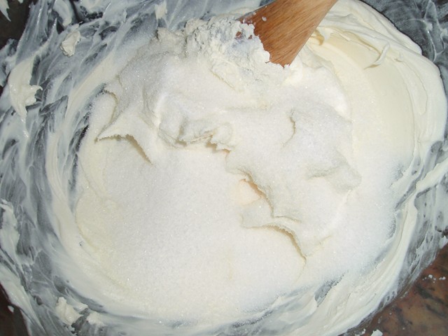 Cuando estén integrados los ingredientes añadimos el resto del queso en 3 tandas. Luego cuando la masa esté homogénea agregar el azúcar y la vainilla.