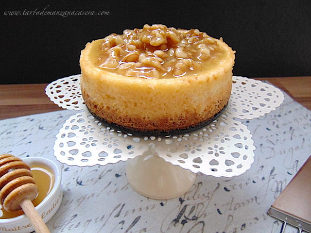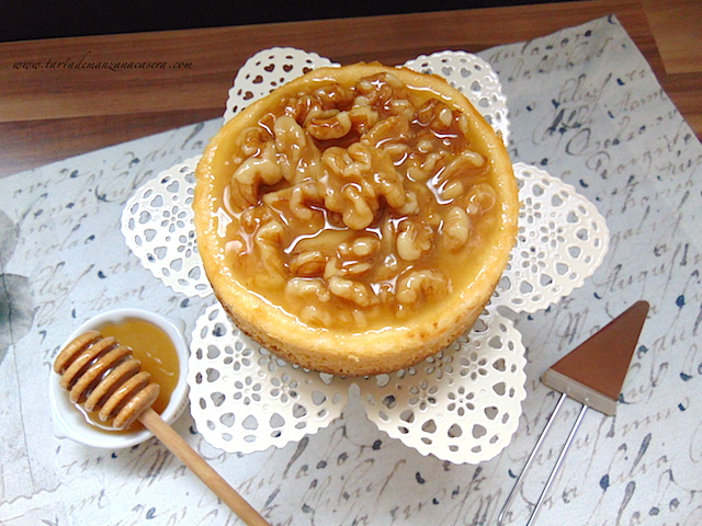 Colocar la cheesecake en un baño de agua tibia, yo utilizo una cazuela de barro. Hornear durante 1h y 15 minutos a media altura a 180ºC con calor arriba y abajo. Es muy importante no abrir el horno en al menos 45 minutos para evitar que se forme una grieta por el cambio brusco de temperatura. Si no queréis que se os dore la superficie, pasado ese tiempo, colocar con cuidado un papel de aluminio por encima y seguir horneando. Es preferible que cuando apaguéis el horno la parte central de la cheesecake esté aún temblorosa. Se acabará de hacer con el calor residual. Mantener en el horno con la puerta un poco abierta para que se enfríe poco a poco. Yo la dejo 20 minutos más y luego la saco y coloco aún dentro del baño de agua en la encimera 30 minutos más. Luego pasado ese tiempo la dejo en su molde sobre una rejilla (un par de horas más). Cuando esté totalmente fría cubrir con papel film y dejar en la nevera un mínimo de 4 h. Mejor aún si es toda la noche. Merece la pena esperar, los sabores serán mmmmmmmm. En fin que yo por un trozo de esta cheesecake MA-TO. Nada de pedirme una cucharadita, es mi TESORO. No respondo.