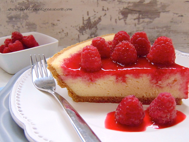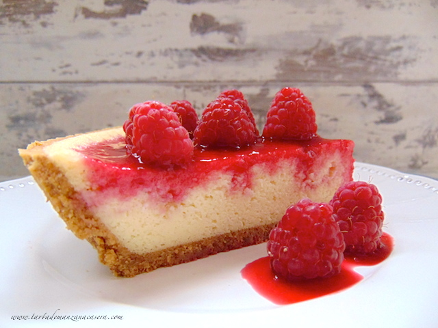 Ahora vamos con la receta. Es una receta sencilla pero tiene 3 pasos por lo que se os puede hacer larga pero vale la pena, os lo garantizo. No queda tan pesada como algunas tartas ni tan ligera como la Cheesecake japonesa. A mí me ha conquistado. En una semana he hecho 3. Importante: hornear la base primero y después hornear la cheesecake en un baño de agua. Al principio cuando las hacía no las horneaba al baño María pero es el mejor truco para que quede jugosa sin resultar pesada, homogénea y con una superficie lisa y sin grietas. Además no hay que sobrebatir las masas. Es muy importante que todos los ingredientes estén a temperatura ambiente para que al batir no se formen grumos pues éstos no desaparecen por arte de magia. Si están antes del horneado seguirán después del mismo. Ahora que lo pienso éste y otros trucos quedarían perfectos en un especial. Prometo hacerlo en breve.