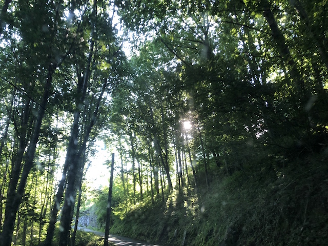 Un paseo por la calzada que baja hasta Arruzpi rodeados de árboles y algunas setas.
