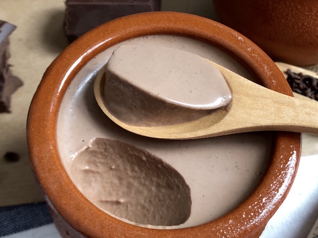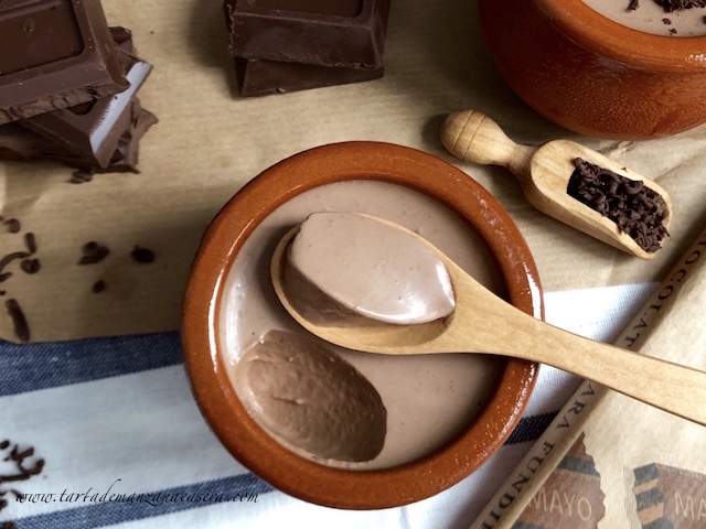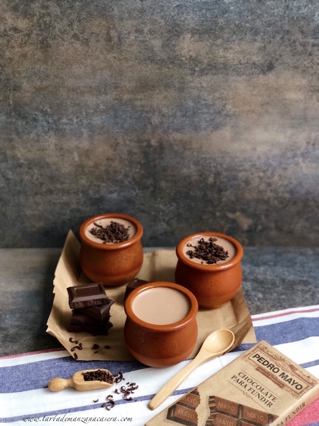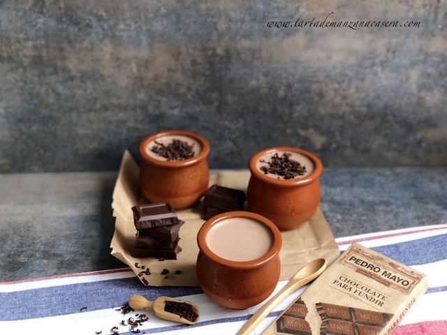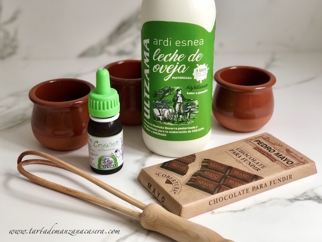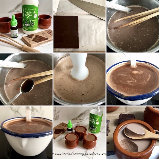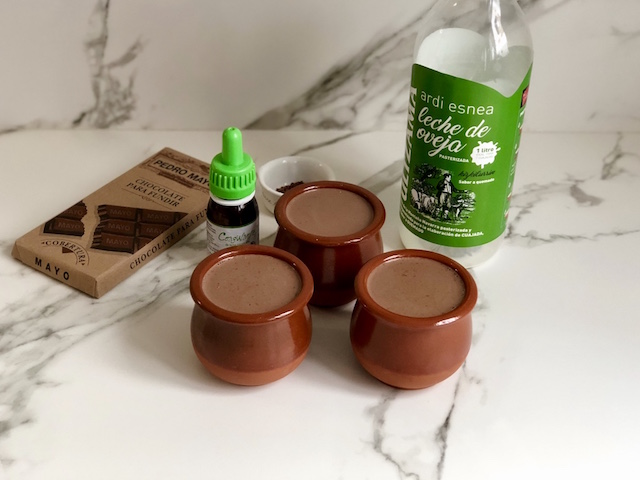 Poner la leche de oveja pasteurizada en un cazo y hervirla. A continuación añadir el chocolate rallado y bajar el fuego sin dejar de remover. Una vez disuelto retirar del fuego y pasarle el turmiz para evitar grumos. Preparar los tarritos con 6 gotas de cuajo, yo lo he utilizado químico y la temperatura que recomienda de la leche es 55ºC. En este caso es muy recomendable utilizar un termómetro para asegurarse de la temperatura y no «matar» el cuajo. Esa es la temperatura a la que recomienda el fabricante de mi cuajo que se debe añadir la leche (en caso de no utilizar cuajo Postres Ultzama ver instrucciones de fabricante). Verter la leche chocolateada sobre los tarritos (siempre poner el cuajo previamente) y dejar que cuaje al menos 10 minutos sin remover ni mover los recipientes. Cuando estén fríos guardar en la nevera cubiertos por film o papel Albal. No os extrañe que no añada azúcar, lleva el procedente del chocolate, y os aseguro que es suficiente. Queda riquísima.