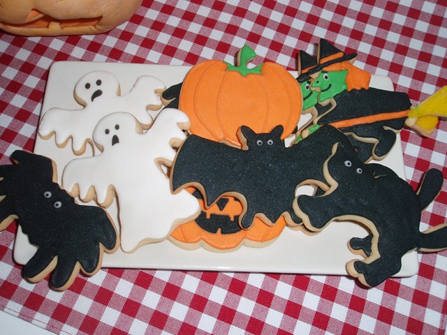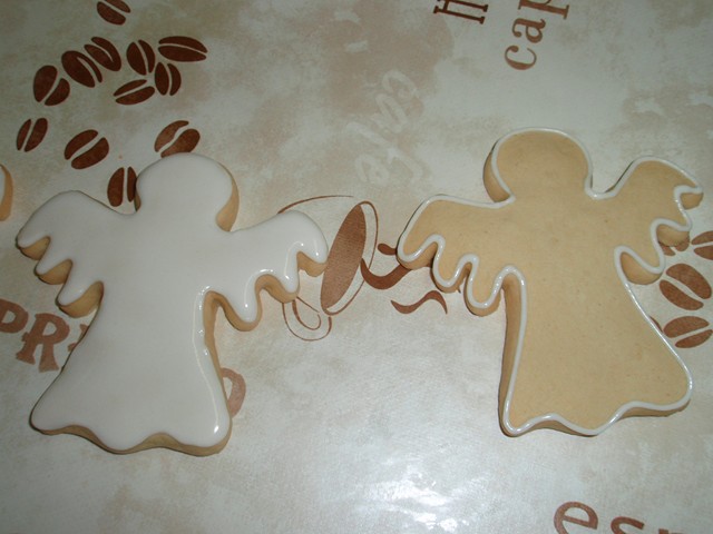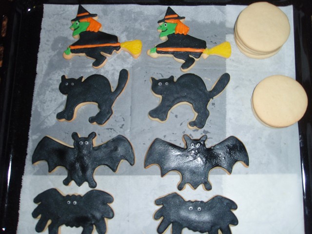 Hornear a 180ºC a media altura durante unos 10-12 minutos en función del grosor de vuestras galletas. Cuando empiece a dorarse un pelín el borde están listas. Ojo que si se tuestan pierden sabor. Dejar que se enfríen y mejor aún 2 par de días en horno frío o latas para que se desgrasen un poco y a decorar. Cuando hago tantas galletas para repartir entre los niños del barrio utilizo glasa ya preparada en seco a la que sólo hace falta agregar agua para hidratarla hasta encontrar la consistencia deseada. Suelo utilizar las marcas de FunCakes o Tate & Lyle de Royal icing o glaseado real. También podéis hacer la glasa casera.