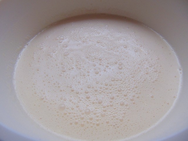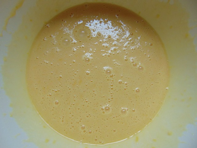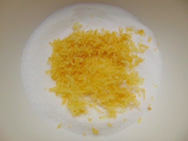 Lavamos la superficie del limón con la ayuda de un cepillo, agua y lavavajillas para que desprenda la cera y lo rallamos finamente. En un bol colocamos la ralladura del limón junto con el azúcar y mezclamos. Añadimos la sal, la harina repostera y la de maíz tamizadas. Batir hasta que se incorporen todos los ingredientes. Luego añadimos los huevos y yemas. Una vez integrados añadiremos la leche y la nata.