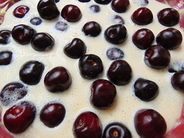 Precalentar el horno a 170º C. Derretir la mantequilla, cubrid con ella el molde con la ayuda de un pincel y espolvorear el azúcar. Colocar las cerezas en el interior del molde y cubrir con la mezcla. Hornear a media altura unos 40 minutos o hasta que quede cuajada.