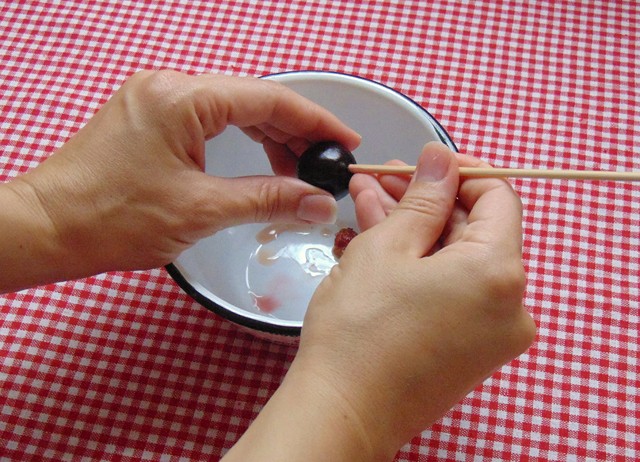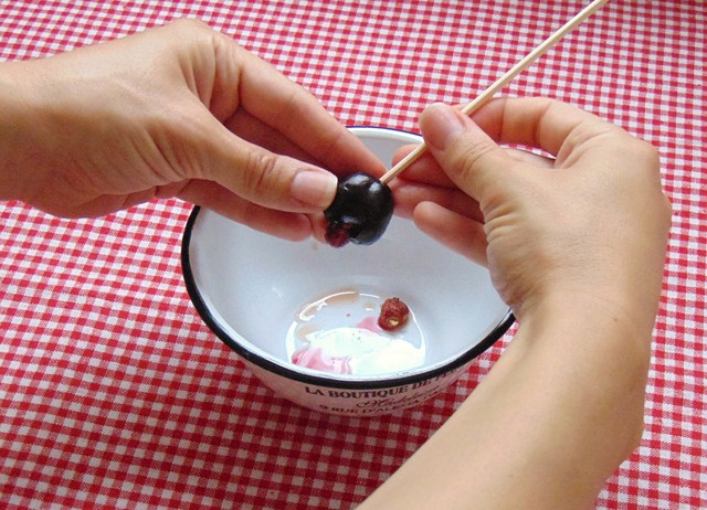 Si queréis saber cómo deshuesar cerezas sólo necesitaréis un palillo de los de barbacoa, más fácil imposible. Sujetáis la cereza como veis en la foto y por el lado contrario al agujerito de donde se arranca el rabito de la cereza colocáis la punta roma del palillo y empujáis. Saldrá solo. La de «carnicerías» que he liado a veces para sacar el hueso de las cerezas, sobre todo cuando con un año mis hijas empezaron a comerlas y se lo quitaba para evitar atragantamientos. Con lo fácil que es así, oh my God.