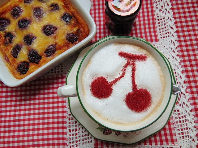 Y aprovechando que me quedaba polvo de arándanos rojos me hice uno de esos cafés que tanto me gustan con siluetas. Como no, esta vez el tema eran las cerezas.