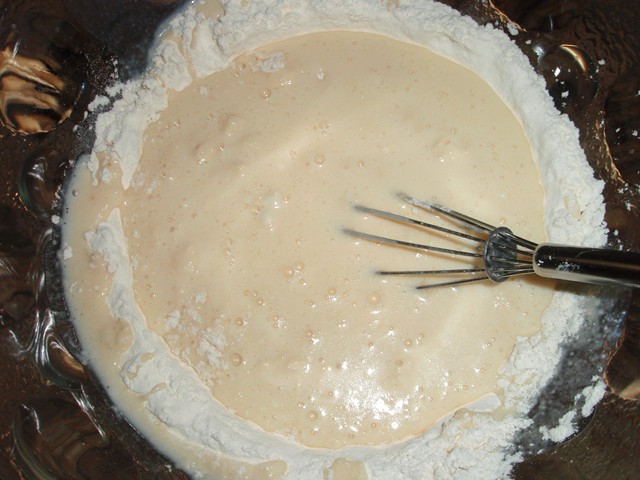 En el bol de ingredientes secos hacer un hueco en medio, añadir la mezcla de líquidos y batir hasta integrar todos los ingredientes pero sin sobrebatir o, como bien dice la receta original, quedarían pesados, y lo que queremos es que estén esponjosos. Así que sin pasarse.