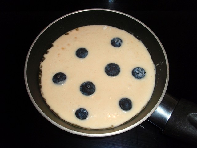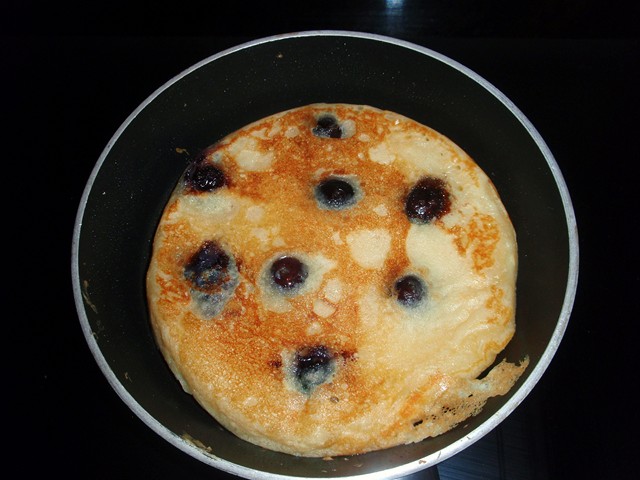 Preparamos una sartén pequeña, la mía sólo la utilizo para las tortitas, de unos 12 cm. Calentarla con un poco de mantequilla para engrasar el fondo a fuego medio. Verter una medida de 1/3 de taza o cup o unos 80 ml de mezcla. Creo que es de las pocas veces que uso las cups o tazas. Añadir los arándanos al gusto y cocinar 2 ó 3 minutos por cada lado.
